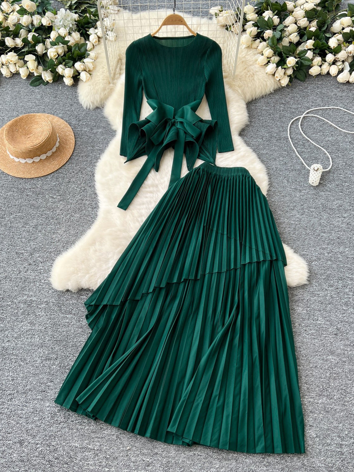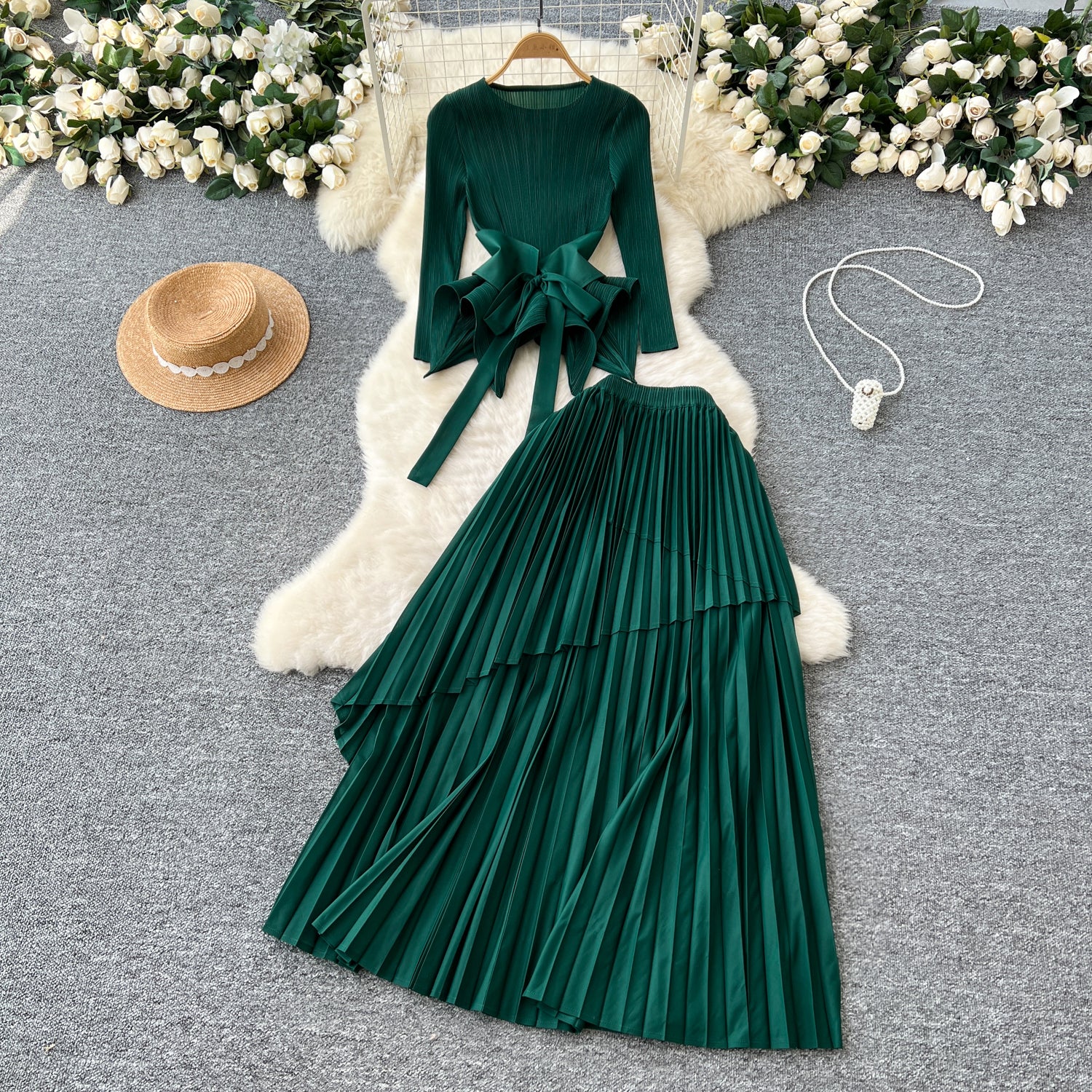 AM03011 Lantern Sleeves To Close The Waist 100 Pleated Skirt Comfort Commuter Leisure Dress HZ0107
