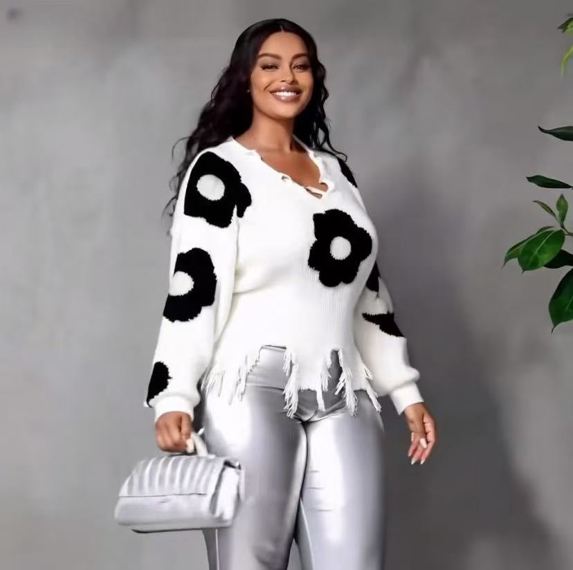 Cross Hole Tuxed Sweater Dark Long Sleeve Loose Knitted Shirt HZ0107