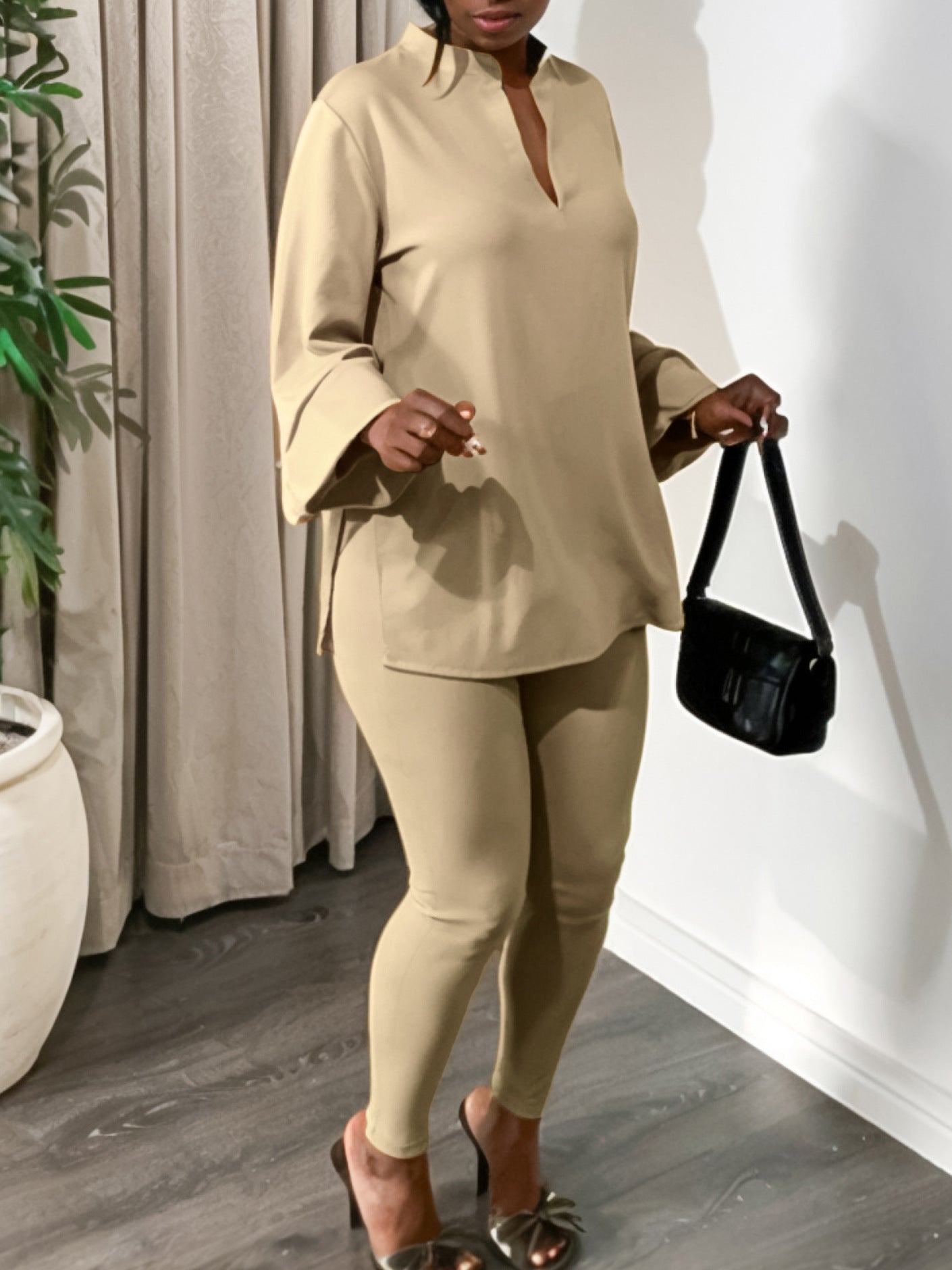 D535 Women's 2025 Autumn And Winter Fashion Style Pure Color V-Neck Long-Sleeve Top Pants African Set HZ0107