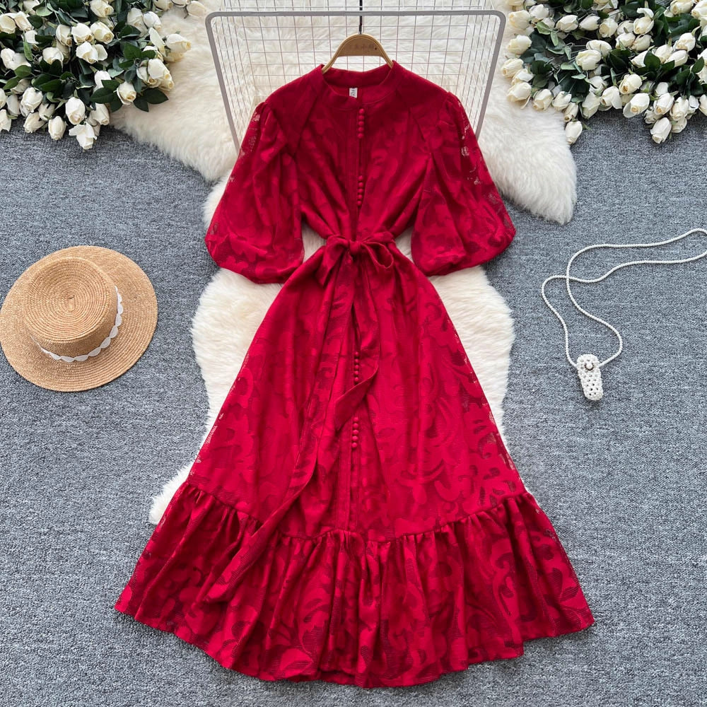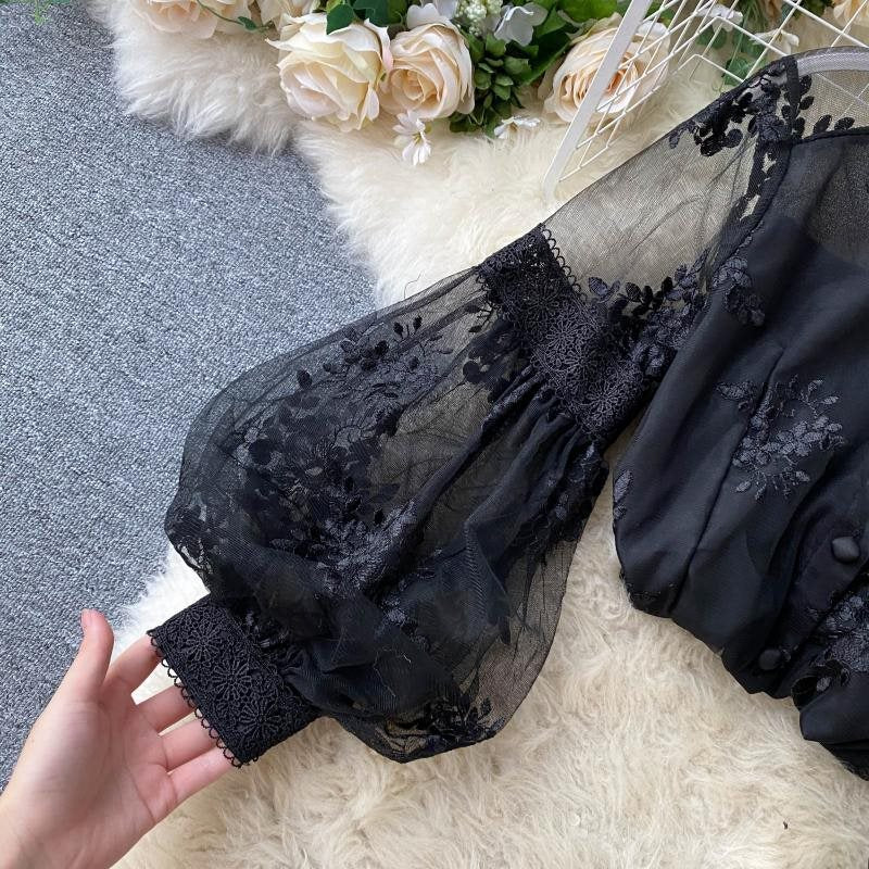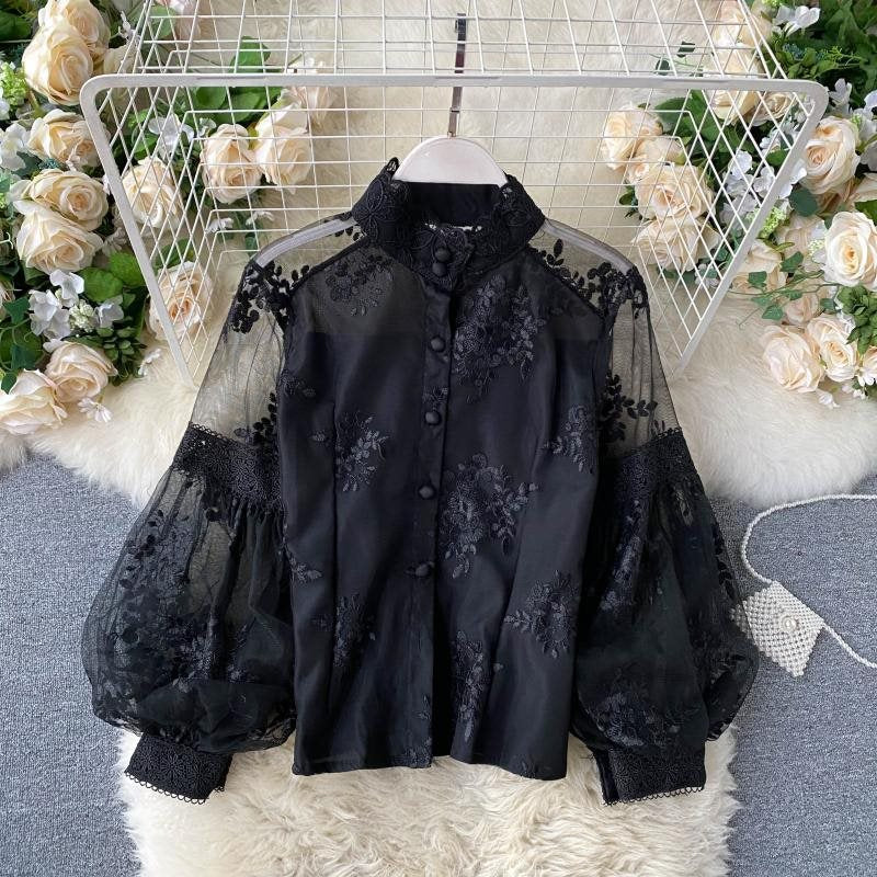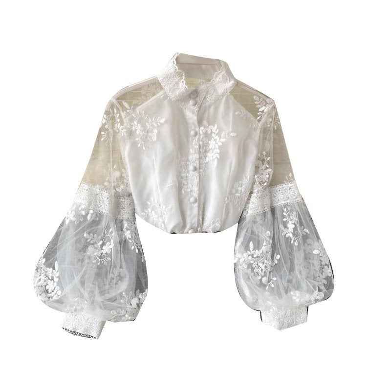 French Retro Mesh Lace Blouse Women's Collar Three-Dimensional Embroidered Bubble Sleeve Court Style Slim Shirt Woman