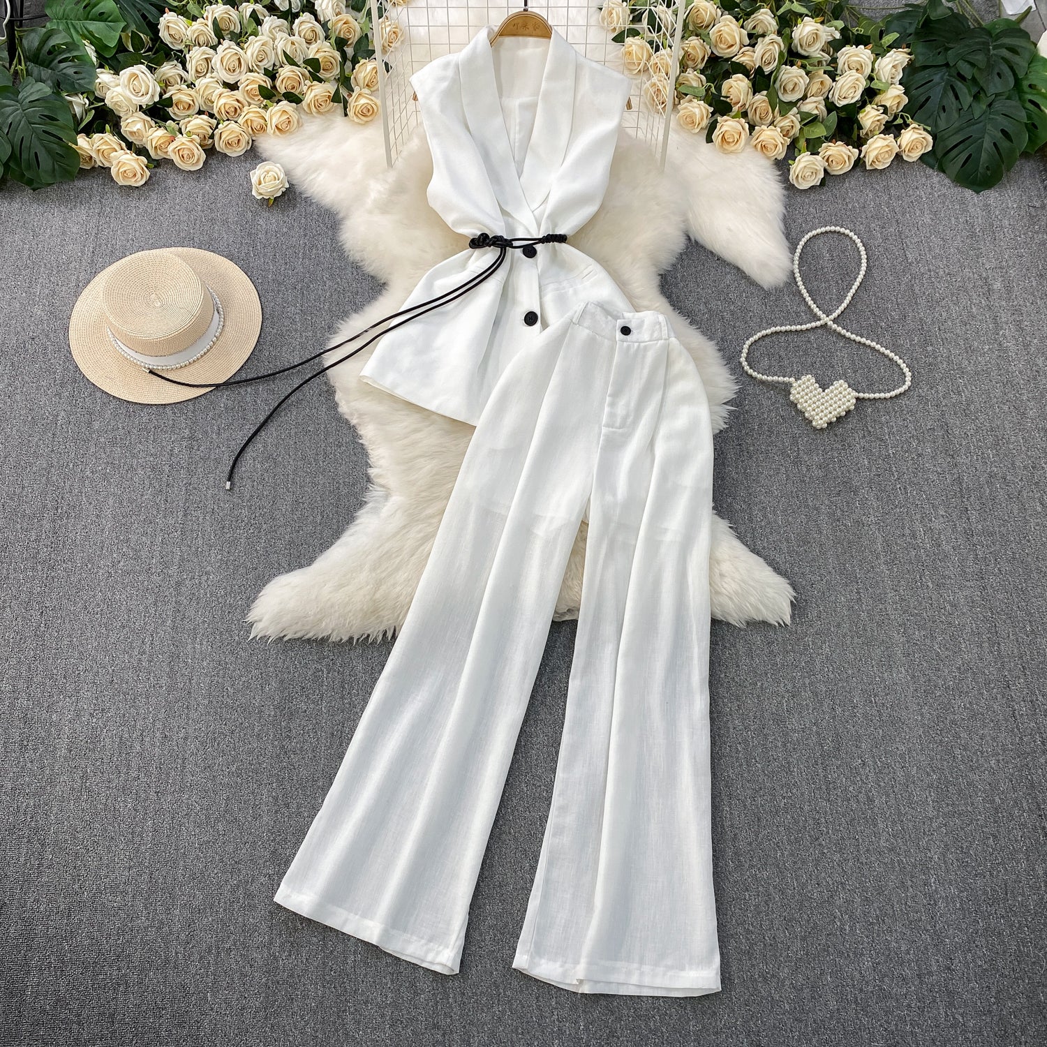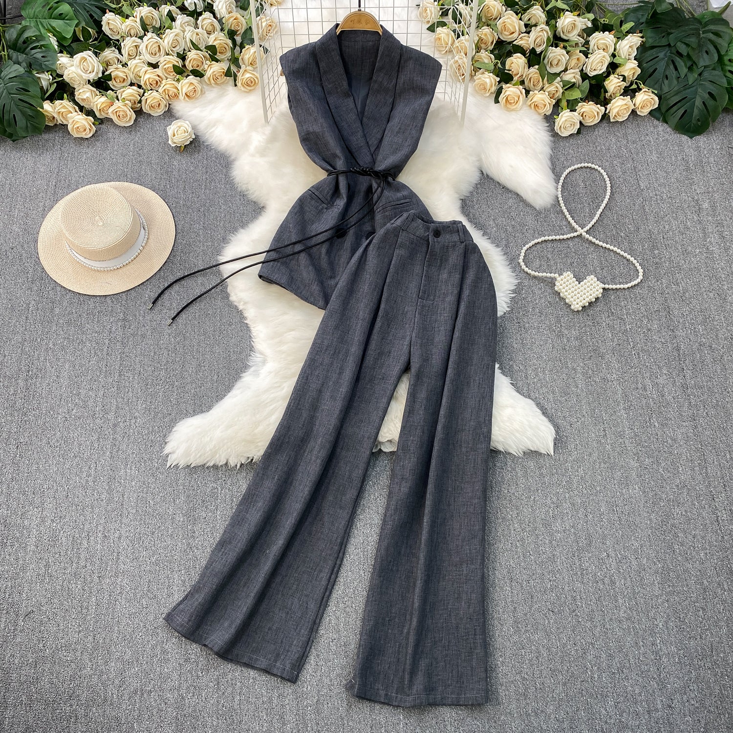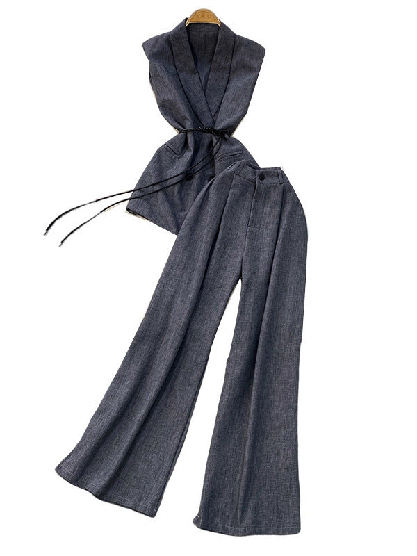 High-Grade Gray West Assembly V-Neck Double Buckle Vest Sleeveless Waist Blouse + High Waist-High-Scretch Broad-Legged Trousers Two
