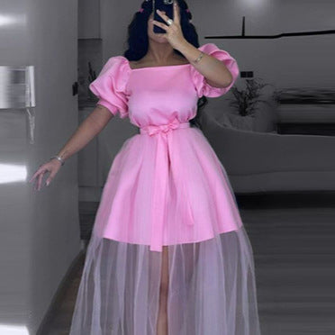 AM03011 Lantern Sleeves To Close The Waist 100 Pleated Skirt Comfort Commuter Leisure Dress HZ0107