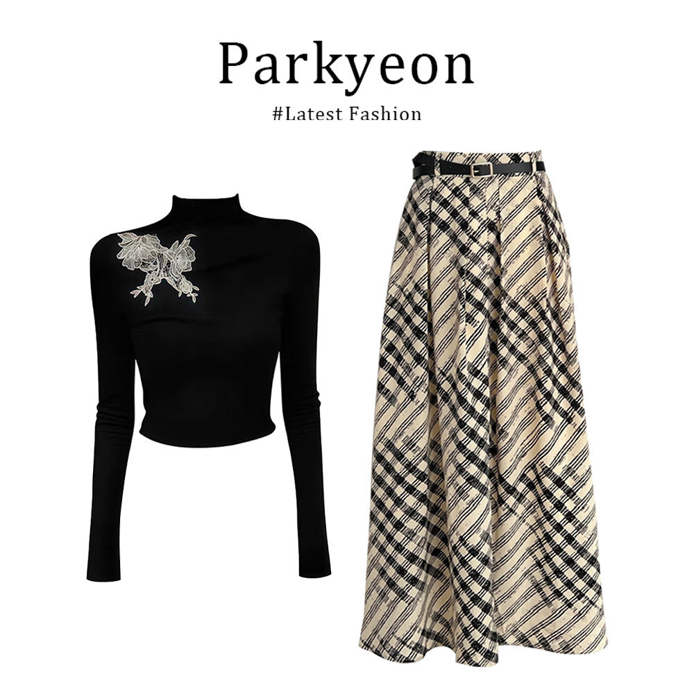Parkyeon New Chinese-Style Atmosphere With Bow Embroidered Long-Sleeved Blouse Dress Autumn Burst Suit