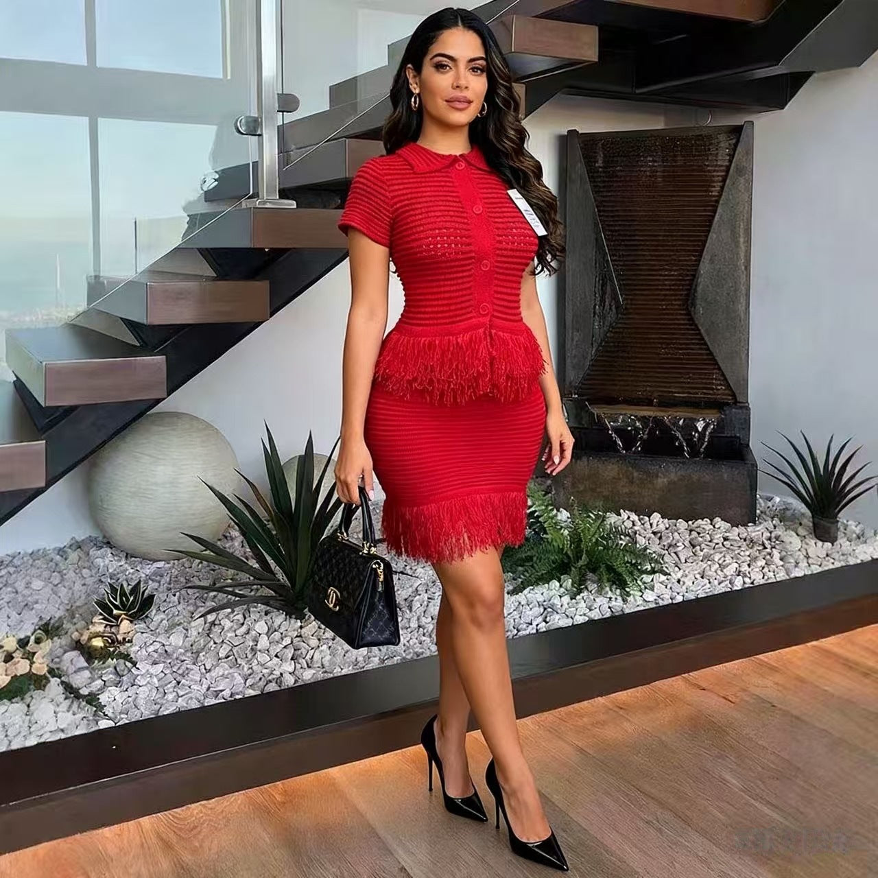 Autumn Temperament Commuting Small Straight-Necked Cardigan Dress Designer Folded Short-Sleeved Top Dress Dress HZ0107