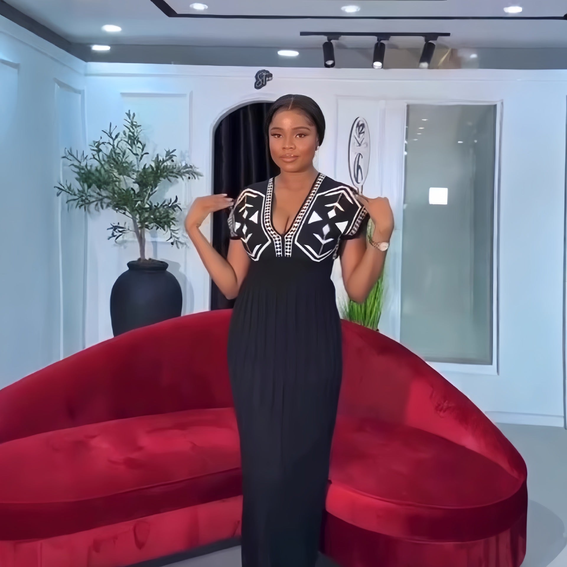 Women's Dress 2025 New Elegant V-Neck High-Waisted Knitted Dress Skirt Short Sleeves HZ0107